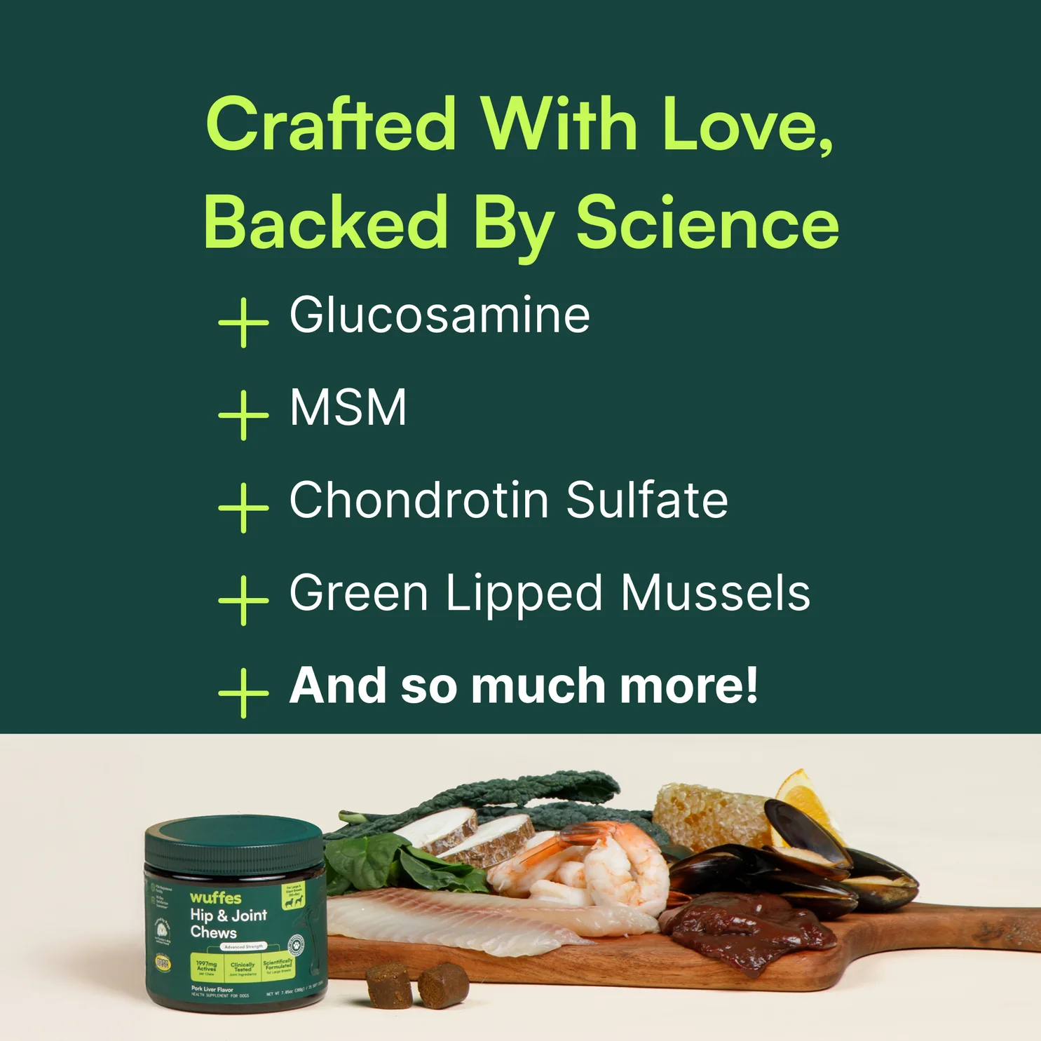 Our Advanced Hip and Joint chews harness the superpowers of Glucosamine, Chondroitin, Green-Lipped Mussels, Hyaluronic Acid and MSM to drive effective and visible results Our formula helps enhance joint health and improve discomfort from normal exercise and aging, helping maintain mobility. Our amazing chews can also be given to younger pups to help promote optimum bone and joint health.Â