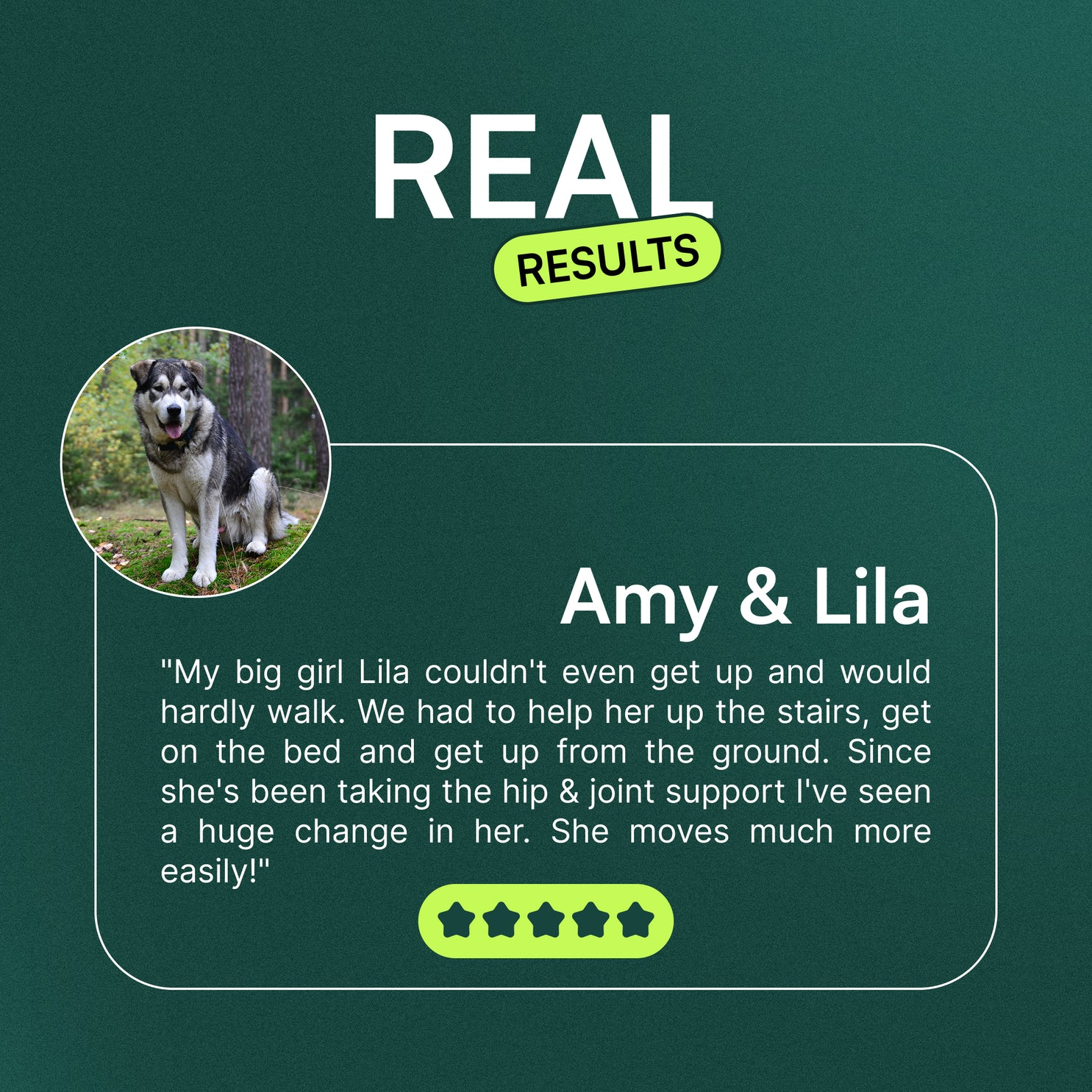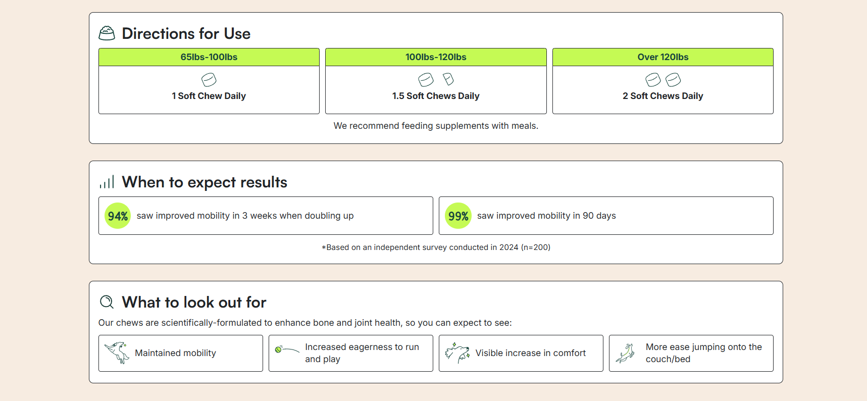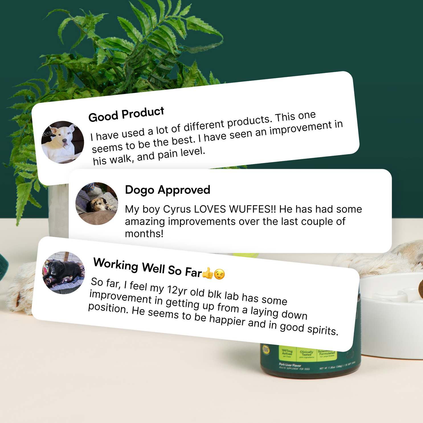 The Truth:Our joint supplements are an important part of a holistic approach to your dog’s well-being, but they're not a magic fix! Regular exercise and a balanced diet are key to maintaining joint health and overall vitality. Think of our supplements as the boost your dog’s joints need to stay happy and active.